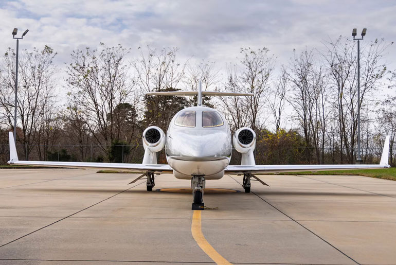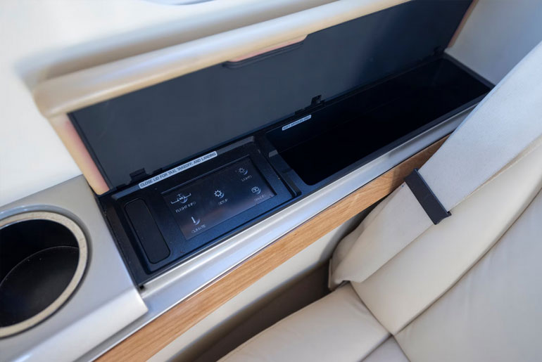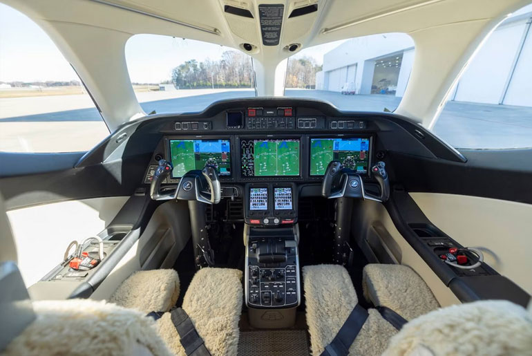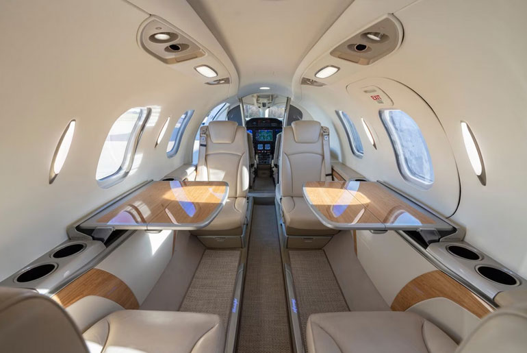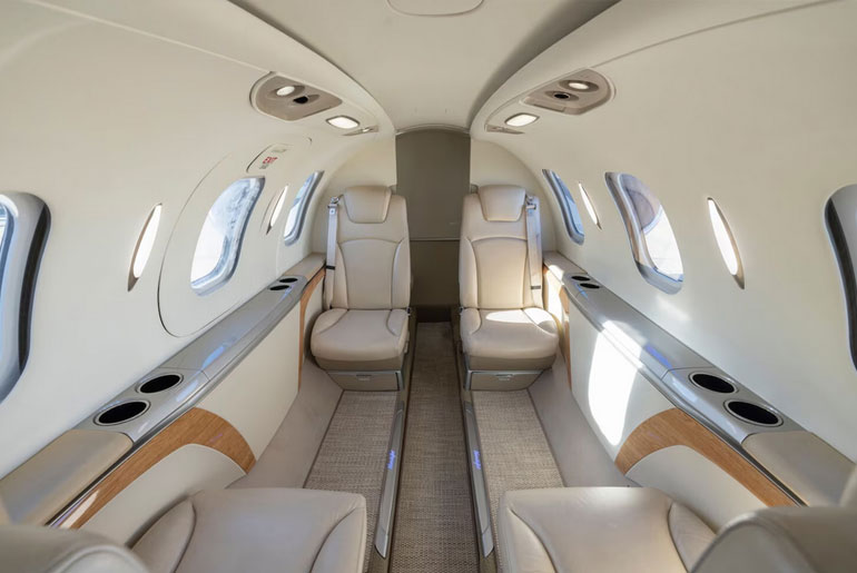 - El interior está configurado para cinco pasajeros, con un asiento tipo club y un asiento lateral con cinturón de seguridad. Además, la aeronave cuenta con un baño privado trasero completamente cerrado.