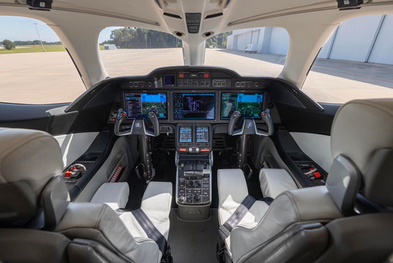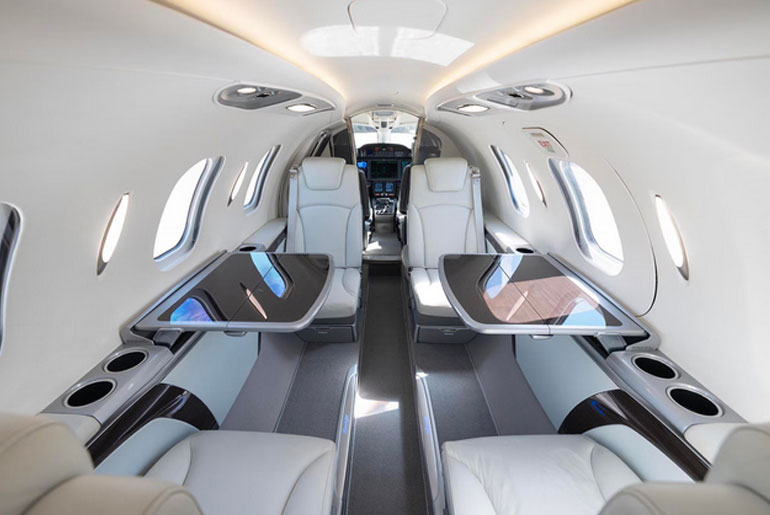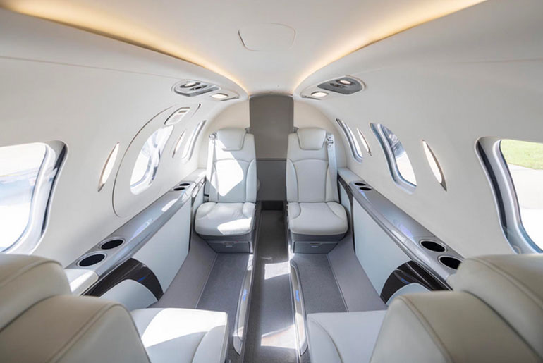 - El interior está configurado con una disposición para 5 pasajeros, con un asiento tipo club y un asiento lateral con cinturón de seguridad. Además, la aeronave cuenta con un baño trasero privado totalmente cerrado.